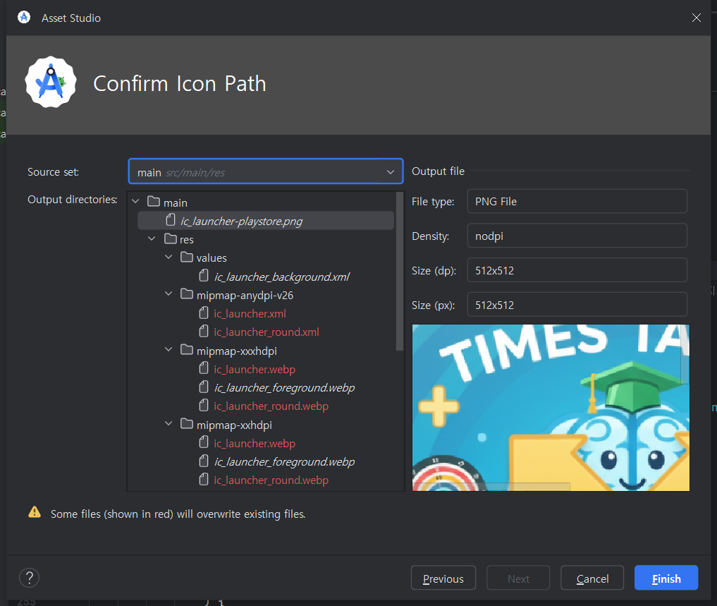 5. Next를 클릭하면, Android Studio가 다양한 해상도의 아이콘 파일들을 자동으로 생성하여 res/mipmap/ 폴더에 넣어줍니다.