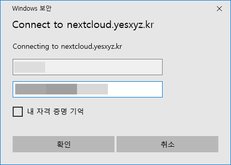 - Nextcloud 설치 후 생성한 사용자 이름과 비밀번호를 입력한 후 확인 버튼을 클릭합니다.
